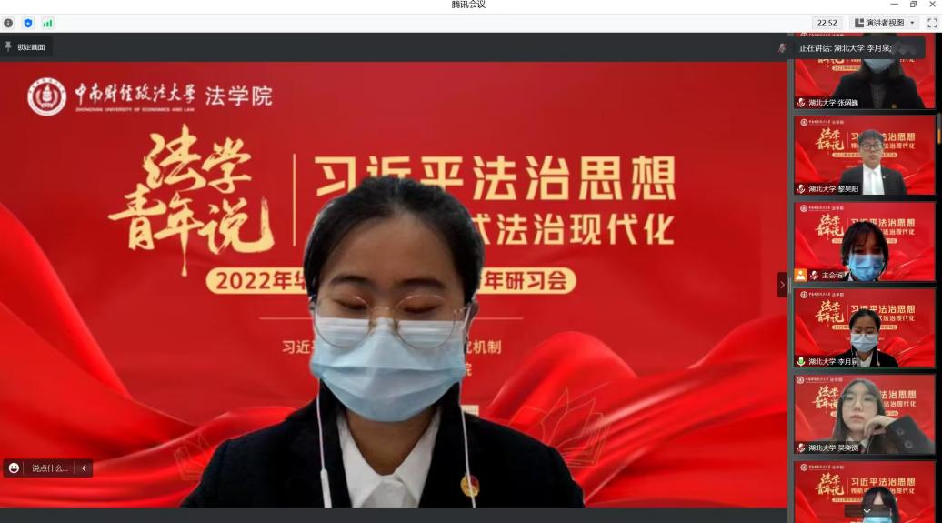 11月24日,为进一步学习贯彻习近平新时代中国特色社会主义思想和党的二十大精神,鼓励引导法科学子树立新时代法治理念,由中南财经政法大学主办,以“法学青年说·习近平法治思想领航中国式法治现代化”为主题的华中地区高校法学青年研习会在武汉举行,ylg060net永利娱高作为分会场第一单位,派出4位优秀学子线上参与并主持了小组研讨会。