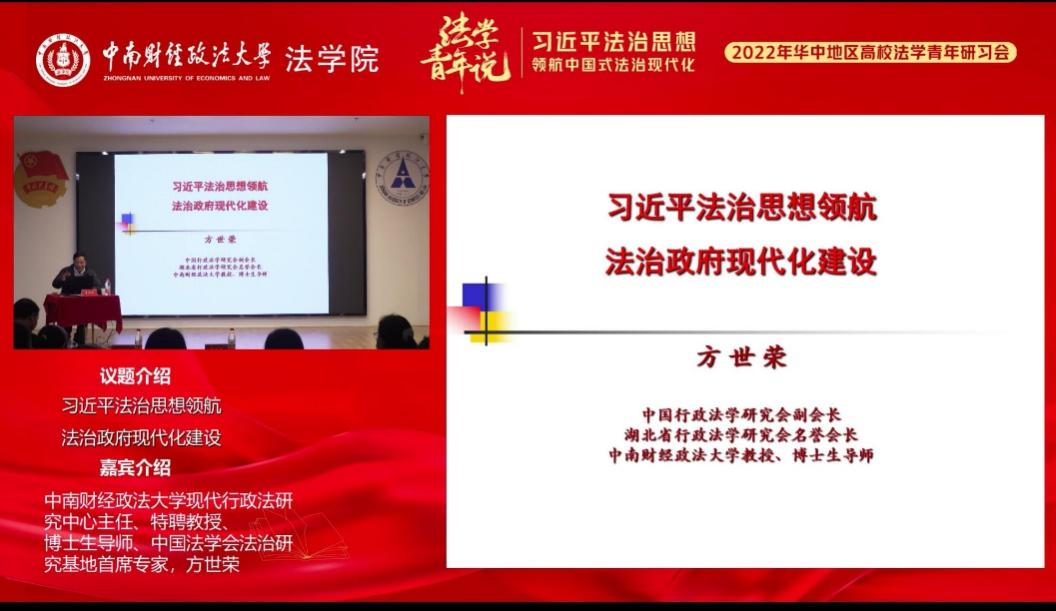 在本次研讨会主题讲座环节,中国行政法学研究会副会长、中南财经政法大学ylg060net永利娱高宪法与行政法学系文澜特聘教授方世荣,围绕“习近平法治思想领航,法治政府现代化建设”这一主题,以法治政府建设为切入口,深刻解读了党的二十大提出的全面建设社会主义现代化国家的宏伟蓝图,全面阐释了习近平法治思想中法治政府建设的丰富内涵。方教授在最后寄语法科学子要努力提升课程学习、学科研究等能力,为我国的法治政府建设贡献添砖加瓦。