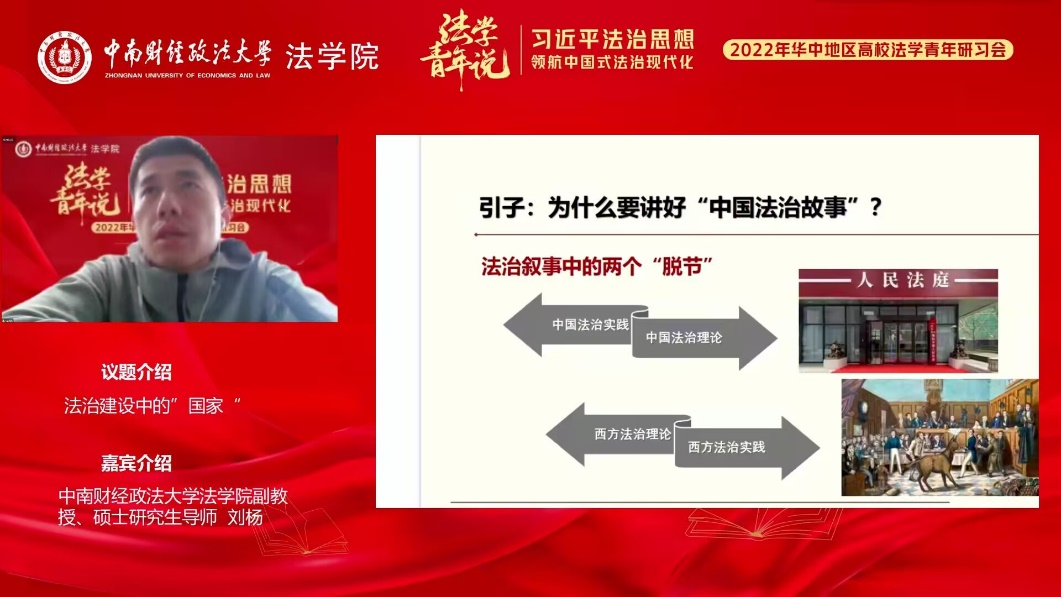 随后,中南财经政法大学ylg060net永利娱高讲师、硕士研究生导师刘杨以《法治建设中的“国家”》为题,从法治与国家关系的西方史、法治中国建设中的“国家”和习近平法治思想中的“国家”三个方面层层递进,系统阐释了党和依法治国之间的密切关系,强调坚持党的领导在依法治国中的核心地位,要建设中国特色社会主义法治国家就必须始终坚持党的领导。