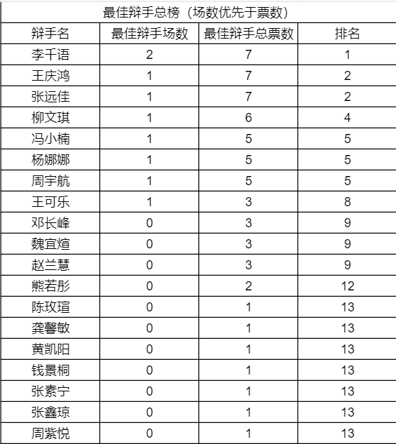 经过三轮激烈而精彩的比赛,根据三个队伍比赛累计的积分,最终的队伍排名和最佳辩手公示如下: