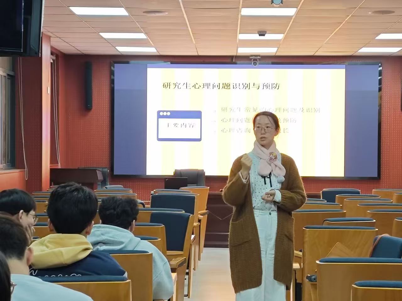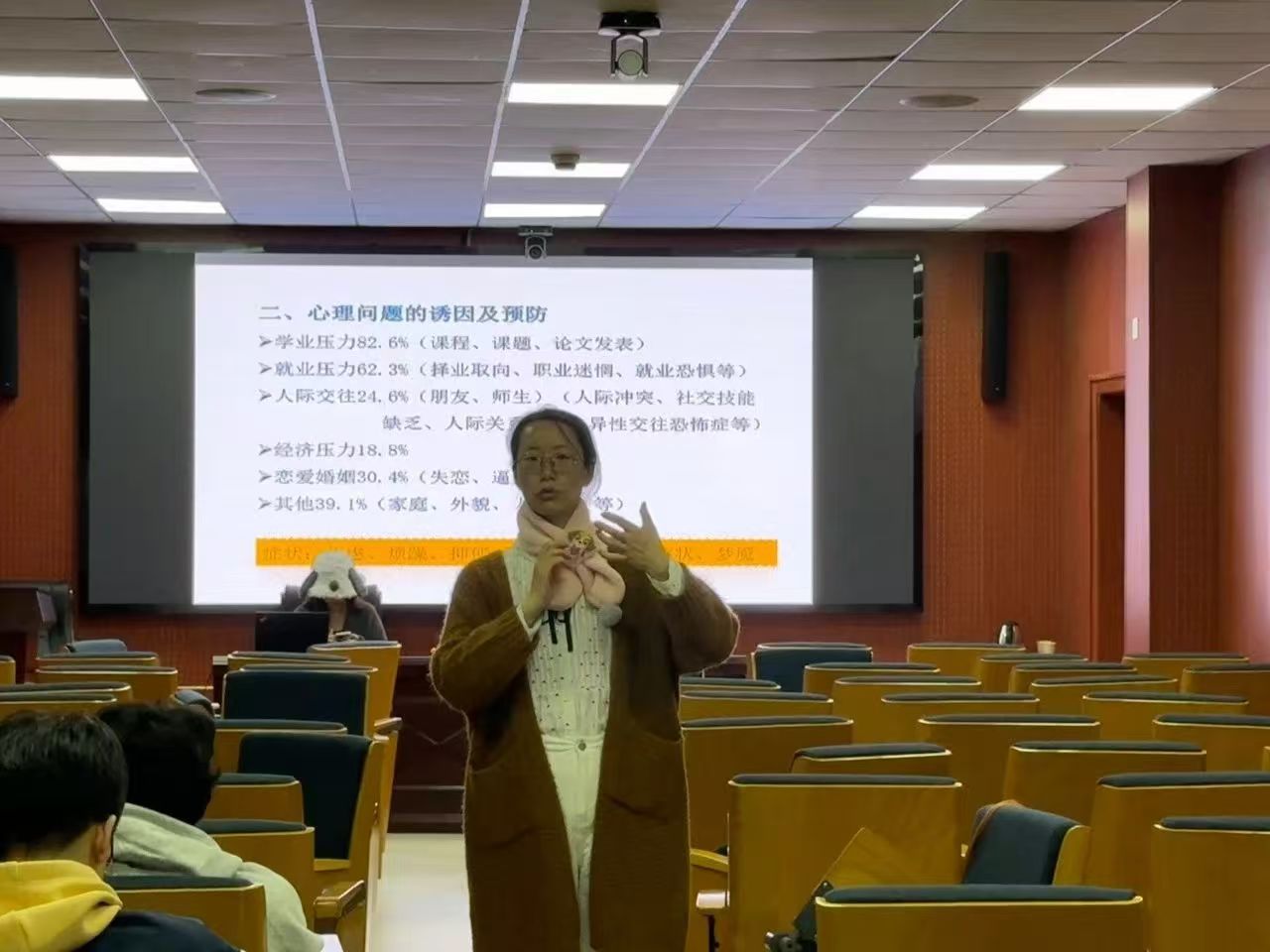 在讲座的第二部分,老师深入剖析了心理问题的诱因,包括学业压力、就业压力、人际交往压力、经济压力以及恋爱婚姻压力等。这些压力源往往相互交织,共同作用于研究生的心理健康。为了预防心理问题的发生,老师提出了提高自我问题辨识力、合理宣泄情绪、主动解决问题、提高人际交往水平以及寻求心理援助等五种有效的预防方法。