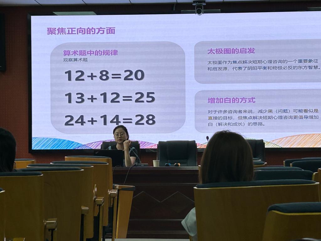 随后,朱老师阐述了焦点解决疗法等重要观点,引导师生转换视角,关注正向积极面。在讲解关于提问技术的环节,朱老师通过生动实例,深入浅出地剖析如何运用这些提问技术挖掘个体自身资源与优势,助力解决情绪问题。讲座还设置案例练习环节,师生积极参与互动,在实际操作中加深对焦点解决疗法的理解与运用。